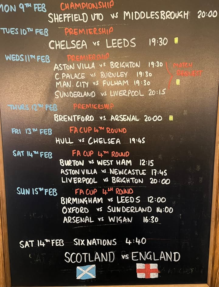 Our Sport and a few Activities for the week Full week of Football. Prem in the week and FA CUP 4th round at weekend MEAT RAFFLE ON SATURDAY AROUND 4.30pm Six Nations back on Saturday. SCOTLAND VS ENGLAND AT 4.40pm THEN OUR NIGHT OF LOVE WITH THE AMAZING LES LOMAX AND HIS BAND. 8pm start